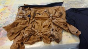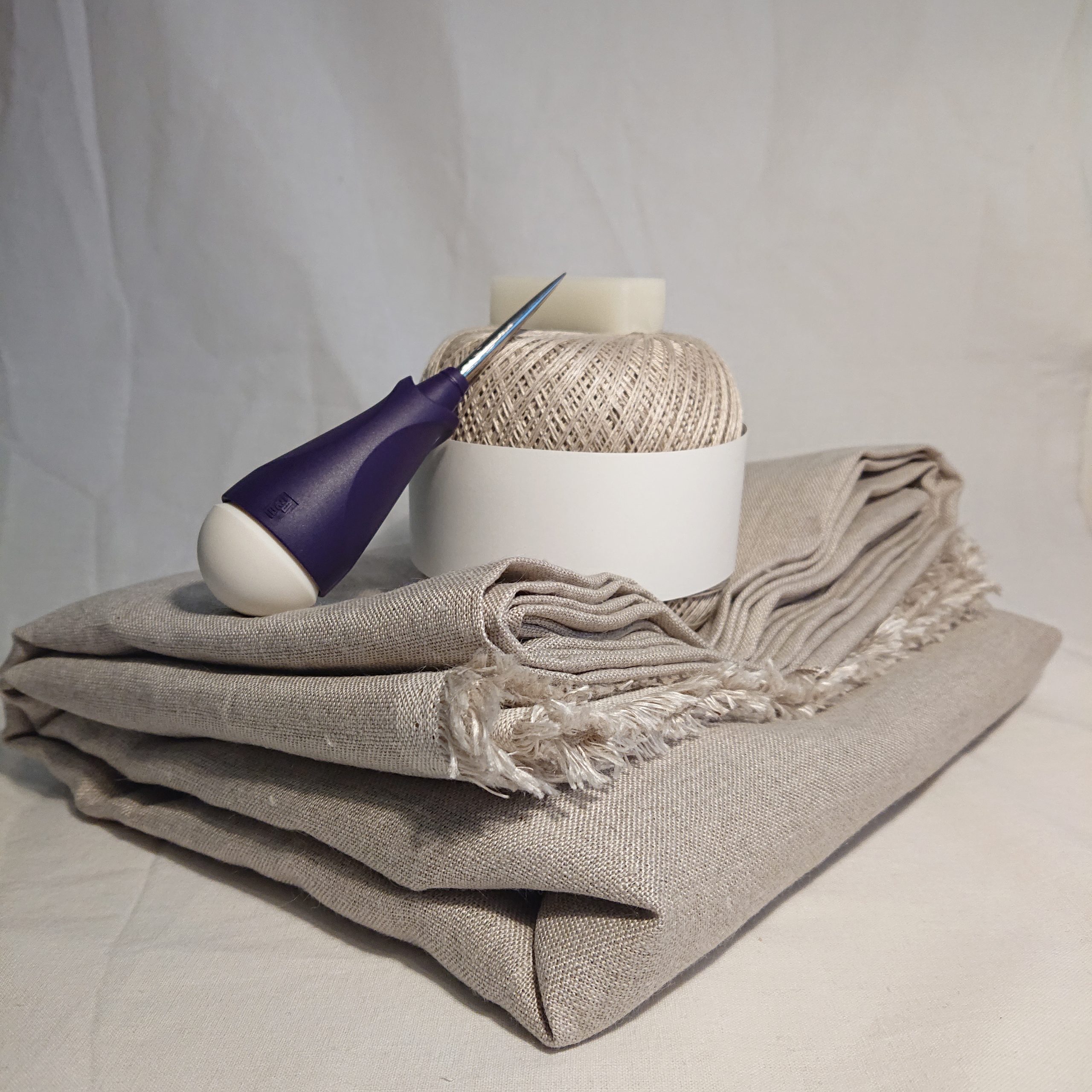 Kuvassa pellavakangas, naskali, pellavalanka ja mehiläisvahapala.